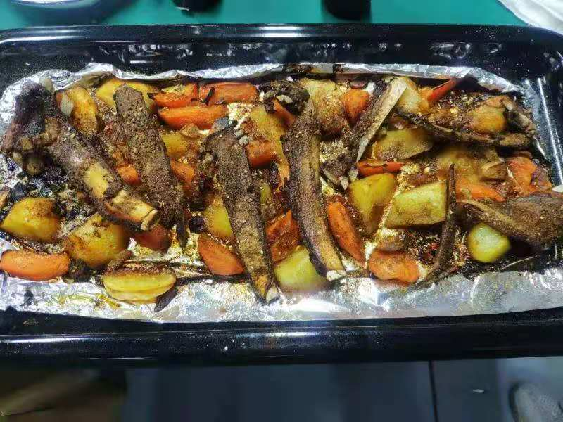 圖2:用其他品牌蒸烤一體集成灶做的烤羊排,靠近錫紙底部的都出烤焦了,受熱不均,熱能無法快速滲透,外部已經(jīng)發(fā)焦,內(nèi)部還沒有熟透。