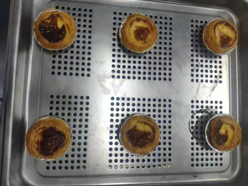 圖3:用其他品牌蒸烤一體集成灶做的蛋撻,表面看上去脆脆的,底部是軟的沒有烤成功,下火太低,沒有多維度立體加熱體系。