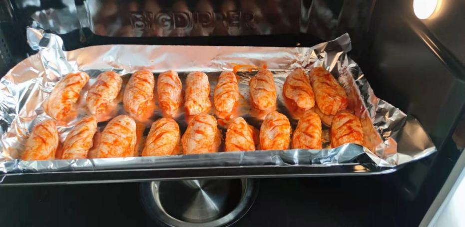 4.北斗星蒸烤集成灶選擇菜譜P15模式,預(yù)熱后放進(jìn)腌制好的雞翅即可;